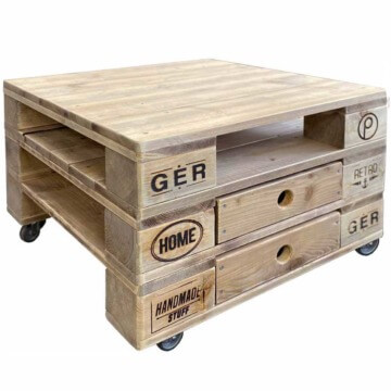 Quadratisch, einfallsreich & voll im Trend! Unser Couchtisch aus Paletten überzeugt durch sein originelles Design und seine Vielfalt. Einsetzbar als Wohnzimmertisch, als Beistelltisch oder als Badezimmer-Regal. Je zwei Schubfächer & Ablagefächer bieten ausreichend Stauraum für Kosmetika.