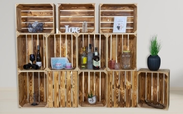 Dieses Obstkisten Möbel Regal aus 12 geflammten Holzkisten bietet Dir viel Platz und eine Menge Abstellmöglichkeiten. Das Regal kannst Du individuell aufstellen und einsetzen. Auch als Raumtrenner oder als Deko,- Bücherregal. Ideal auch für Flaschen, Deko aller Art, um Sammlerstücke zu präsentieren oder zum Ladenbau zur Präsentation von Waren.