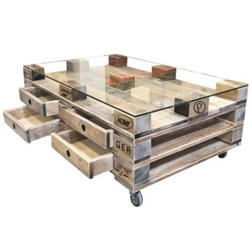 Auf der Suche nach einem großen Couchtisch, der außergewöhnlich, stilvoll und voll im Trend liegt? Dieser mondäne Palettentisch samt Glasplatte & Schubladen ist ein außergewöhnliches Prachtstück. Die Tischplatte aus 8mm starkem Verbundsicherheitsglas (VSG), die Unterkonstruktion aus massiven Europaletten & das Design im originellen Vintage-Style. Vier Rollen, zwei davon feststellbar, erlauben Dir ein kinderleichtes Verschieben, damit Du dieses Prachtstück auch überall präsentieren kannst, wo Du möchtest.
