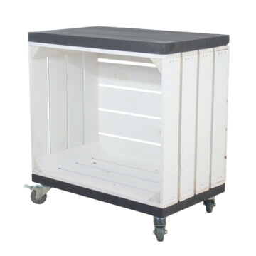 Dieses Regal aus einer weißen Holzkiste mit schwarzen Bohlenbrettern bietet Dir ausreichend Ablagefläche und zudem einen tollen Charme. Dank der Rollen lässt sich das Holzkisten Regal problemlos bewegen und verschieben.