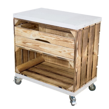 Dieses Regal aus einer geflammten Holzkiste bietet Dir viel Platz und Stauraum und kann dank der montierten Rollen problemlos bewegt werden. Der tolle Look aus einer geflammten Holzkiste in Kombination mit den weißen Bohlenbrettern verleiht Deiner Wohnung einen besonderen Charme.