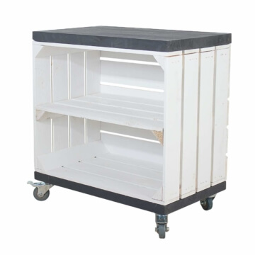 Dieses Regal aus einer weißen Holzkiste, bietet Dir in Kombination mit den schwarzen Bohlenbrettern einen tollen Charme. Dank der Rollen kannst Du das Regal problemlos bewegen. Das Mittelbrett bietet Dir zusätzliche Ablagefläche.