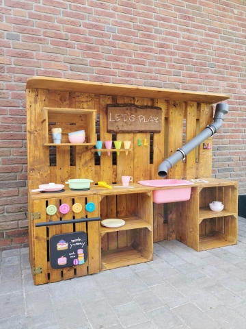 Du willst eine besonders große Matschküche selber bauen? Das ist natürlich kein Problem. Die einzelnen Holzkisten, Truhen, Paletten und die Lasur kannst Du auch einzeln im Shop bestellen