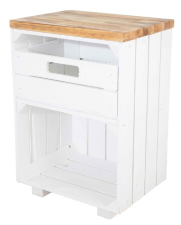 Dieser Nachttisch aus einer weißen Holzkiste bietet Dir mit seiner Ablagefläche und einer Schublade genug Platz für Deine Utensilien. Das geflammte Bohlenbrett rundet das Erscheinungsbild perfekt ab. Das Nachttischchen steht auf Füßen aus Holz.