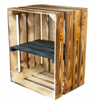 Geflammte Holzkiste als Regalkiste.