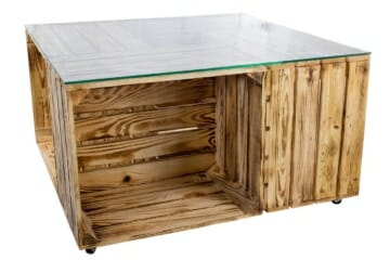 Couchtisch aus geflammten Apfelkisten – Glasplatte & Rollen inkl.
