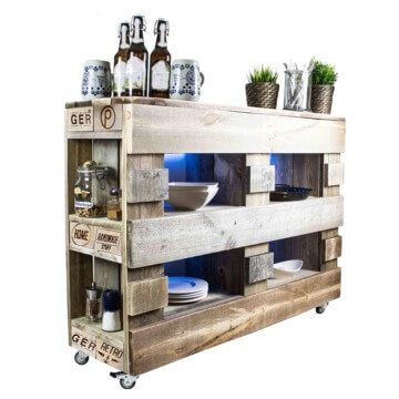 Eine stilvolle Paletten-Bar mit LED Beleuchtung & Fernbedienung. Origineller kannst Du Deine Spirituosen, edlen Geschirre, Bücher oder Pflanzen gar nicht in Szene setzen. Dazu stehen Dir vier frontale & zwei seitliche Ablagefächer (links & rechts) zur Verfügung. Vier Rollen, zwei davon feststellbar, erlauben das kinderleichte Verschieben und individuelle Platzieren dieser außergewöhnlichen Kommode aus Europaletten.