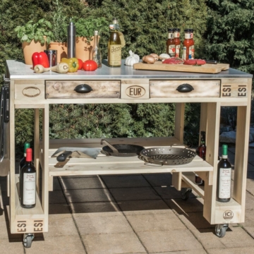 In sorgfältiger Handarbeit von professionellen Schreinern aus Deutschland hergestellt, lässt sich dieser hochwertige Grilltisch aus Europaletten flexibel einsetzen. Vier Rollen, zwei davon feststellbar, erlauben ein kinderleichtes Verschieben und individuelles Platzieren.