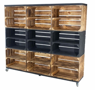 Dieser Raumtrenner aus neun Holzkisten bietet Dir neben viel Abstellfläche auch einen tollen geflammt / schwarzen Look. Dank der Rollen kannst Du das Regal problemlos verschieben. Die Bohlenbretter in schwarz runden das Erscheinungsbild perfekt ab.
