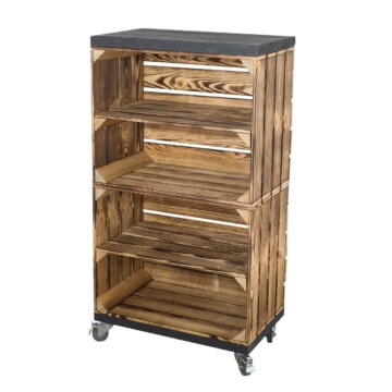 Dieses Regal aus zwei geflammten Obstkisten bietet Dir mit jeweils einem Mittelbrett viel Abstellfläche für Dekoration, Bücher und mehr. Dank der Rollen kannst Du das Regal problemlos verschieben. Die Bohlenbretter in schwarz runden das optische Erscheinungsbild perfekt ab.