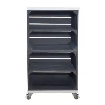 Dieses Regal aus zwei Obstkisten bietet Dir mit jeweils einem Mittelbrett ausreichend Platz für zum Beispiel Bücher oder Dekoration. Die Bohlenbretter in weiß runden das optische Erscheinungsbild der schwarzen Obstkisten perfekt ab. Dank der Rollen lässt sich das Regal problemlos von A nach B schieben.