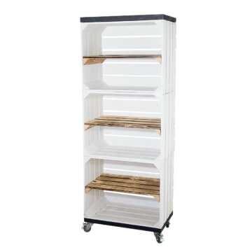 Dieses Regal aus drei weißen Obstkisten bietet Dir nicht nur viel Abstellfläche, sondern auch einen tollen Look. Die Mittelbretter in geflammt in Kombination mit den weißen Obstkisten und den schwarzen Bohlenbrettern sorgt für einen besonderen Charme. Du kannst das Regal dank der Rollen problemlos verschieben.
