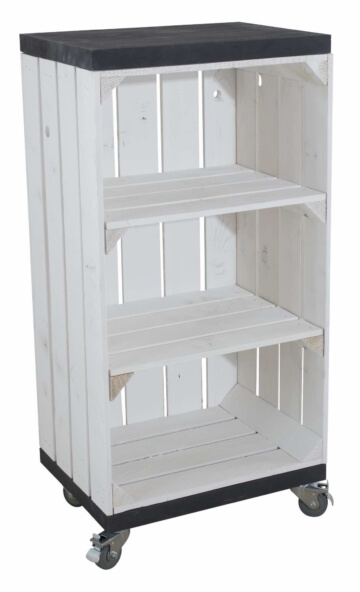 Dieses Regal aus einer weißen Obstkiste mit 2 Mittelbrettern bietet Dir ausreichend Abstellfläche für Bücher, Deko und mehr. Die Bohlenbretter in schwarz runden das Erscheinungsbild perfekt ab. Dank der montierten Rollen kannst Du das Regal problemlos bewegen.